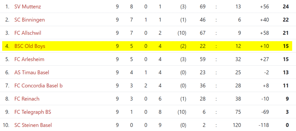 Um auf Platz 3 vorzurücken, dank weniger Strafpunkte als Allschwil, hätten wir z.B. einen Sieg gegen Concordia (0:1 verloren) und gegen Allschwil (0:1 verloren) benötigt.